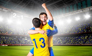 soccer or football players are celebrating goal on stadium soccer or football players are celebrating goal on stadium
